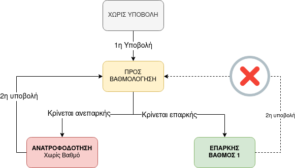 Μόλις υποβάλετε εντός της προθεσμίας των δυο εβδομάδων μια δραστηριότητα ανάθεσης εργασίας αυτή μεταβαίνει στην κατάσταση ΠΡΟΣ ΒΑΘΜΟΛΟΓΗΣΗ. Όταν ο επιμορφωτής-τρια σας την ελέγξει τότε θα συμβεί ένα από τα παρακάτω: