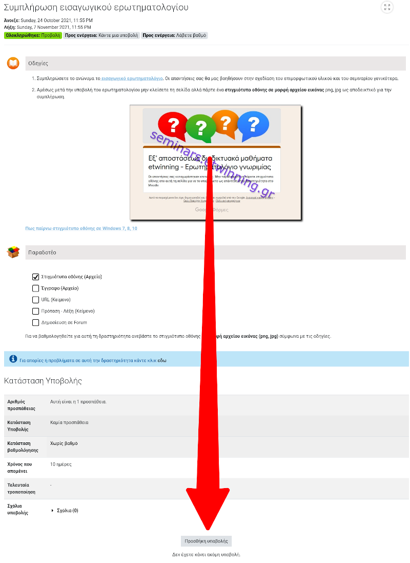 Ερωτηματολόγιο. Σας ζητείτε να απαντήσετε σε ένα ερωτηματολόγιο. Συνήθως τα ερωτηματολόγια είναι προαιρετικά και δεν προσμετρούνται στον τελικό βαθμό.