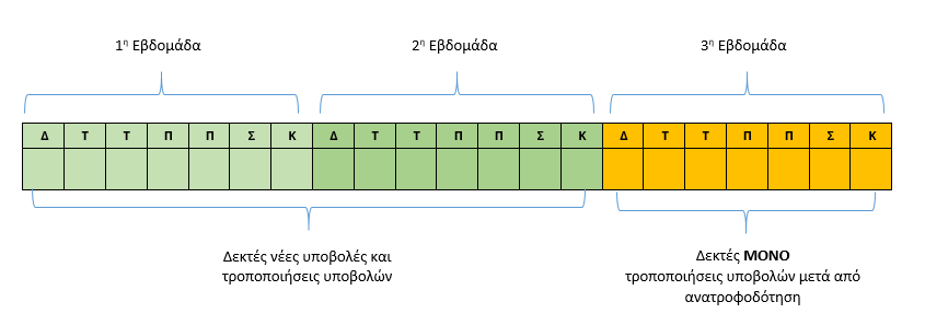 Μόνο σε περίπτωση λανθασμένης πρώτης υποβολής ο επιμορφούμενος έχει περιθώριο μέχρι το τέλος της 3ης εβδομάδας να υποβάλλει εκ νέου δεύτερη υποβολή στη δραστηριότητα η οποία και θα επαναξιολογηθεί από τον επιμορφωτή. Όλες οι δραστηριότητες "κλειδώνουν" μόλις παρέλθει διάστημα 3ων εβδομάδων.