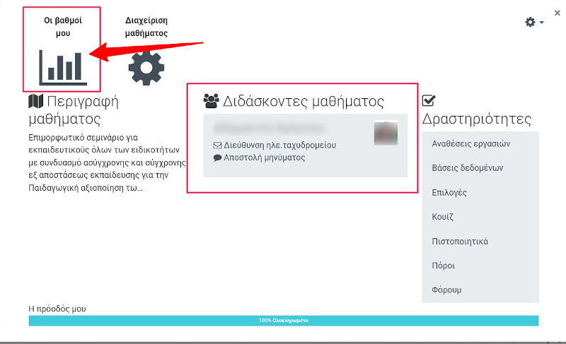 1. Βεβαιωθείτε πρώτα ότι βρίσκεστε στη σελίδα του αντίστοιχου μαθήματος, σε περίπτωση που συμμετέχετε και σε άλλα μαθήματα