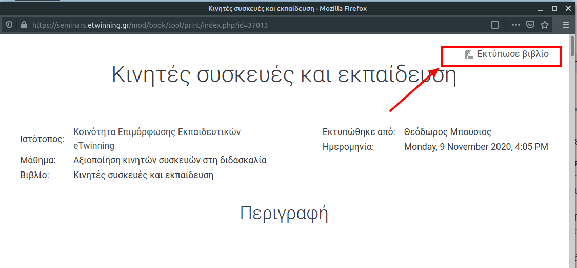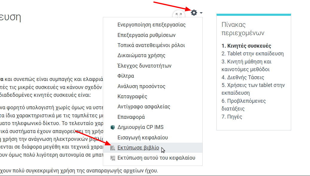 Μπορείτε να εκτυπώστε ή να μετατρέψετε σε pdf το επιμορφωτικό υλικό που υπάρχει σε ένα μάθημα και είναι σε μορφή βιβλίου (book) ή σελίδας (page).