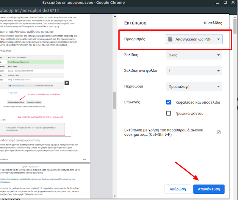 3b Αν χρησιμοποιείτε το περιηγητή ιστού Chrome θα ανοίξει το παρακάτω παράθυρο. Στο πλαίσιο Προορισμός επιλέξτε τον εκτυπωτή ή τη λειτουργία αποθήκευσης σε PDF.