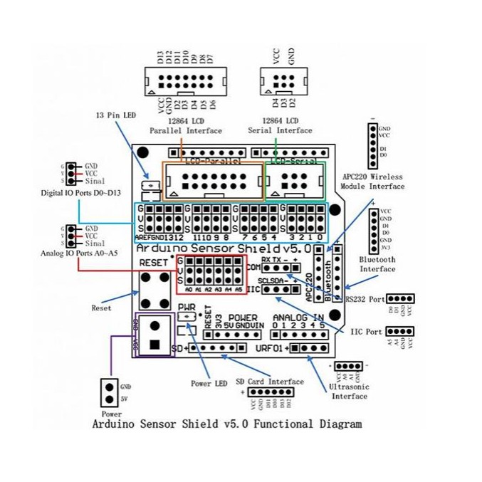 Το συγκεκριμένο shield έχει στόχο να μας διευκολύνει στην σύνδεση πολλών αισθητήρων αλλά και ενεργοποιητών. Το επιτυγχάνει επεκτείνοντας τα pin που ήδη υπάρχουν σε τριάδες της μορφής (Ground, Voltage, Pin) ώστε να μπορούμε για κάθε pin (είτε αναλογικό κόκκινη περιοχή είτε ψηφιακό γαλάζια περιοχή) να έχουμε μαζί και την πηγή (5V) και τη γείωση (GND). Έτσι παρατηρήστε ότι στην κόκκινη περιοχή πάνω από το Α0 υπάρχει S που αντιστοιχεί στο pin A0, υπάρχει V που αντιστοιχεί στα 5V αλλά και G που αντιστοιχεί στην γείωση. Όμοια τριάδα υπάρχει για κάθε pin, ενώ μπορείτε να παρατηρήσετε ότι υπάρχει και υποδοχή bluetooth, LCD οθόνης, αισθητήρα υπερήχων κ.α.